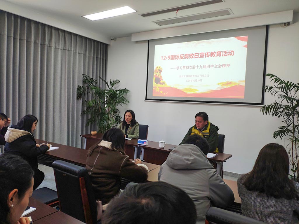 為進(jìn)一步提升黨員干部的廉潔自律意識(shí),增強(qiáng)廣大黨員干部的防腐拒變能力,根據(jù)景區(qū)《組織開(kāi)展“12.9”國(guó)際反腐敗日宣傳教育活動(dòng)的通知》要求,2019年12月10日上午,全域公司黨總支召開(kāi)全體黨員大會(huì),開(kāi)展了“12.9”國(guó)際反腐敗日活動(dòng)。公司監(jiān)事長(zhǎng)練剛組織全體黨員集中學(xué)習(xí)了黨的十九屆四中全會(huì)精神和景區(qū)相關(guān)文件。公司全體黨員干部及財(cái)務(wù)、采購(gòu)等重點(diǎn)崗位人員集中觀看了警示教育片,通過(guò)活動(dòng),大家進(jìn)一步提升了廉潔自律意識(shí),深化了思想認(rèn)識(shí),接受了思想洗禮。公司總經(jīng)理徐順美要求在座的每位黨員干部,要把深入學(xué)習(xí)十九屆四中全會(huì)的精神作為當(dāng)前的重要政治任務(wù)來(lái)抓,認(rèn)真學(xué)習(xí),學(xué)深悟透,同時(shí)通過(guò)觀看警示教育片,要求在座的各位緊密結(jié)合公司工作實(shí)際和個(gè)人崗位實(shí)際,提升工作,優(yōu)化流程,相互提醒,嚴(yán)格監(jiān)督,共同改進(jìn)工作,時(shí)刻筑牢思想防線(xiàn),切實(shí)規(guī)范自身行為,同時(shí)加強(qiáng)安全監(jiān)管,做好防火防盜和用電安全,強(qiáng)化安全管理和資金管理,發(fā)揮黨員先鋒模范作用。